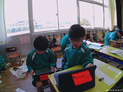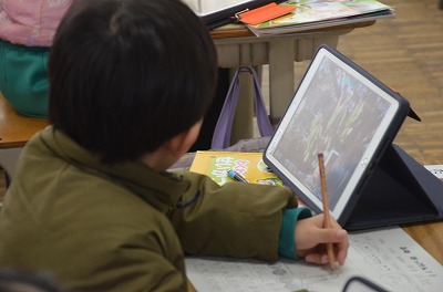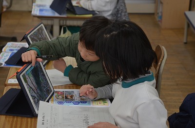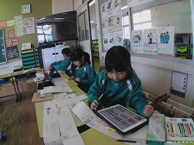 ◇生活科 冬見つけの様子を動画や画像に撮っておき、それを見ながら今日は教室でワークシートに絵と文でかいていました。友だちと映像や画像を見ながら「あの時はこうだったね」などと話しながら楽しそうに活動をしていました。一人の子から「また、今度公園に行ったときにみてこよう」というつぶやきが聞かれました。もっと見てこよう、もっと知りたいなと思う心はとても素敵ですね。