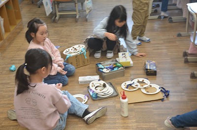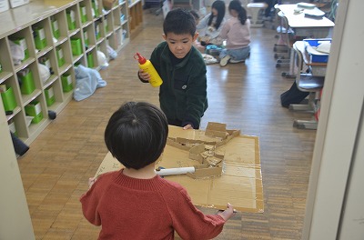 ◇生活 来週、近隣の幼稚園の年長さんを招いて「おもちゃらんど」をします。今日はその準備をしていました。お互いに話し合いながら準備をしていました。