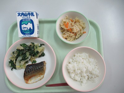 麦飯、サバのみそ焼き、切り干し大根の含め煮、ごまあえ、牛乳