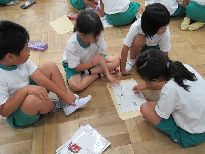 楽しげに相談し、できたリズムをたたいて確かめていました。