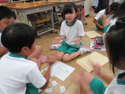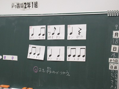 指定されたリズムを組み合わせて、自分たちのリズムを作ります。