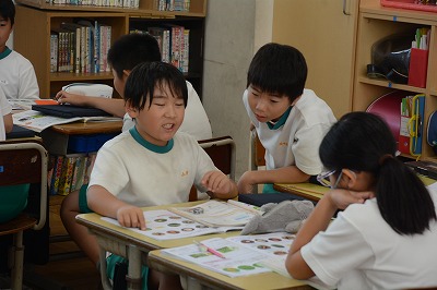 ◇理科 黒板に書かれた虫の名前を見ながら 同じところと異なるところをみんなで考えました。