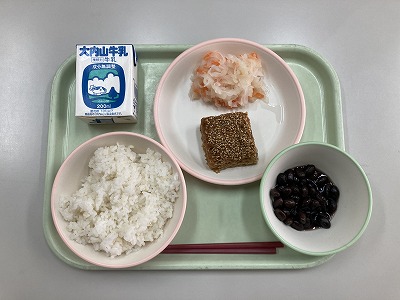 麦飯、まつかぜ焼き、黒豆、紅白なます、牛乳