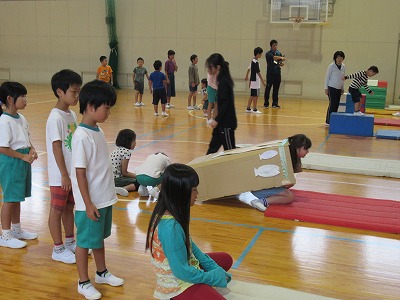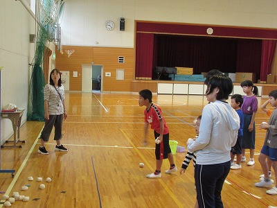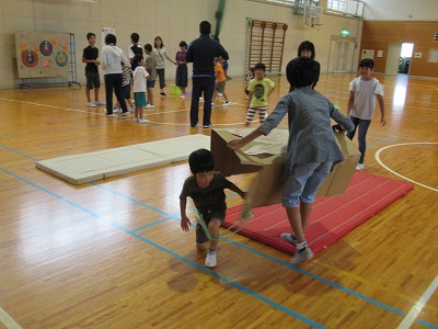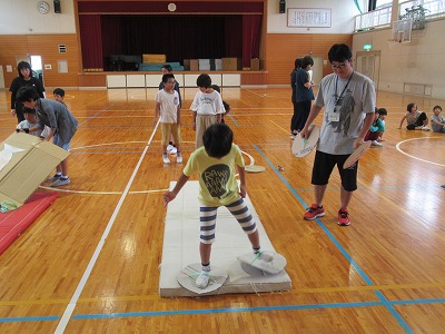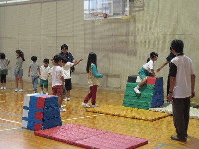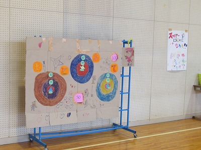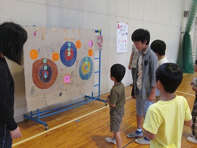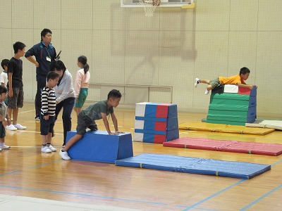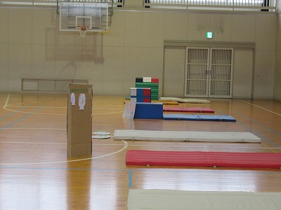 この時間に体育館に用意されたのは「的投げ」「飛び越え」「川渡り」です。