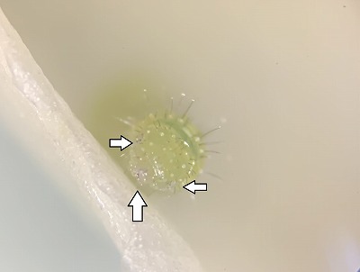 これが、よう虫の顔です。やじるしのところに目と口があります。