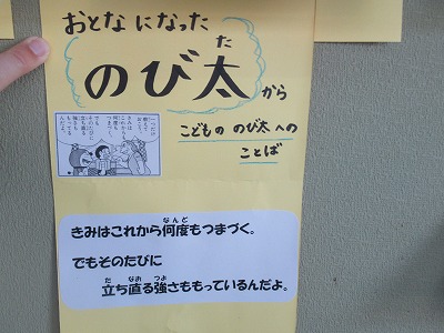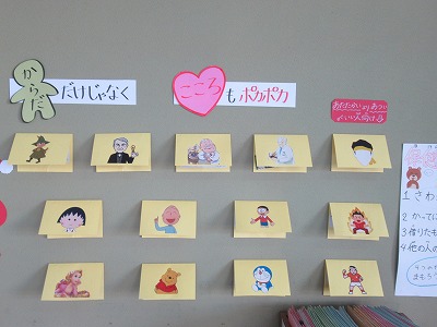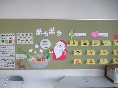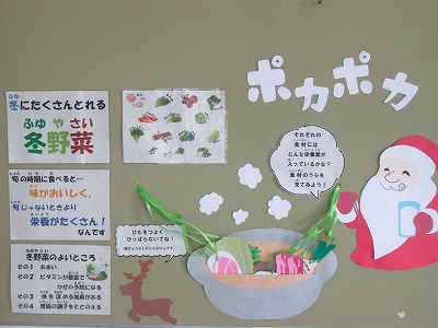 保健室前掲示がリニューアルしました。今回は寒さに負けない体と心を作るため、冬野菜の紹介と、心がホッとする著名人の言葉です。