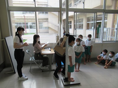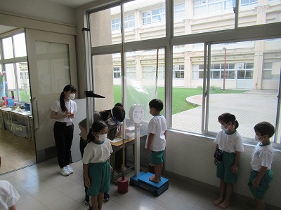 今日から身体測定が始まりました。子どもたちは測定を待つ間も話をせず、静かに待っていました。また、できる限りの感染対策を講じて測定します。
