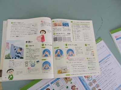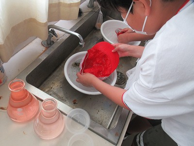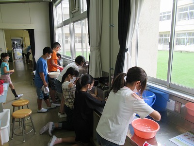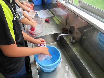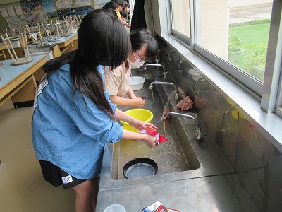 手で洗濯をする実習でした。ふだん洗濯機で洗濯するのが当たり前の世の中ですが、力を込めてごしごしと赤白帽子やハンカチを洗う6年生が印象的でした。中学校へ行って部活動でユニフォームなどを手洗いする場面があるのではないでしょうか。