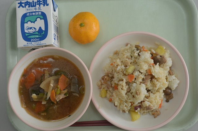 【給食】牛乳 炊き込みご飯 豚汁 みかん