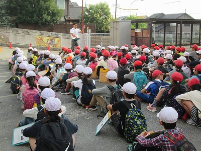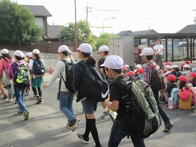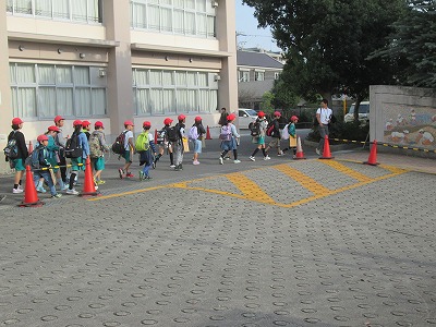 児童玄関前に集合し、確認した後、出発します。