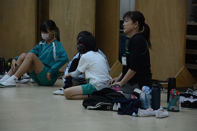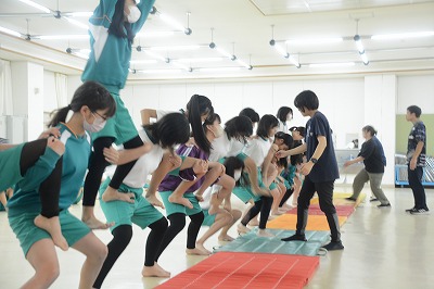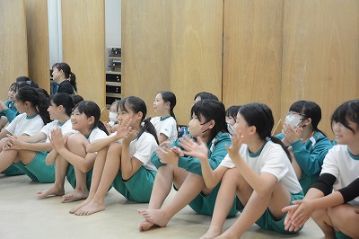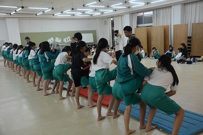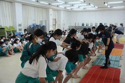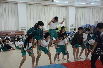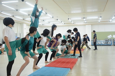 今日は雨で運動場が使えませんでしたのでふれあいホールを使って組体操の基礎練習を行いました。