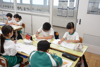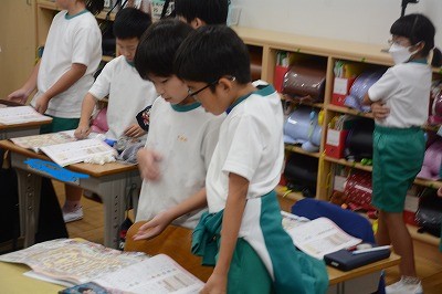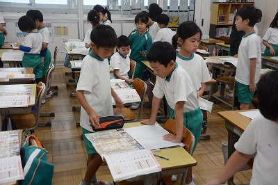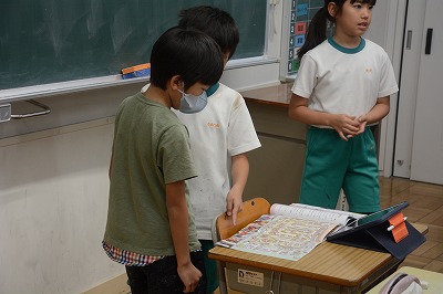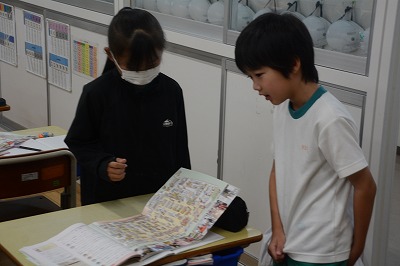 ◇社会 教科書の挿絵を見ながら、働いている人の工夫だと思うことを探し、紹介し合いました。