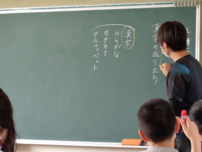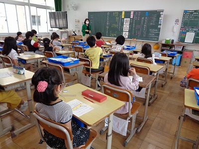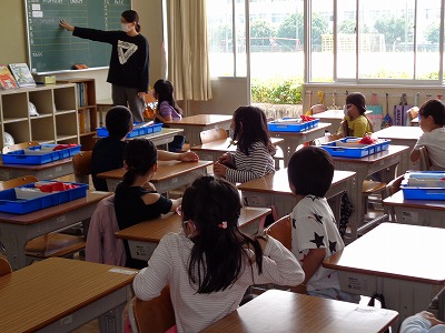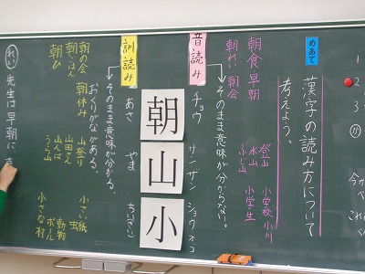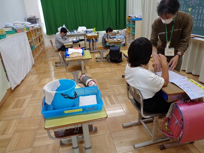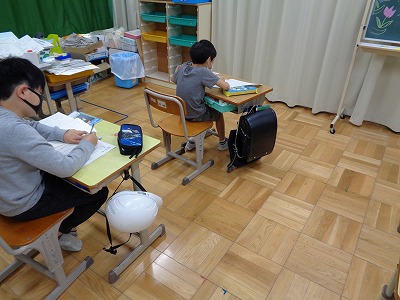 昼のあいさつをみんなでします。「こんにちは」 今日のお勉強は国語と算数と・・・・です。