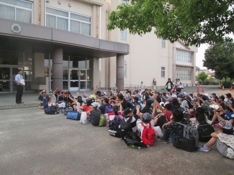 2限目に中学校と合同で避難訓練を行いました。避難の指示が入ると子どもたちは口を押え、姿勢を低くし、しゃべらずに速やかに非難ができました。来ていただいた消防署の方からも後から「子どもたちの避難するときや待っている時の姿にびっくりしました。」とお褒めの言葉をいただきました。