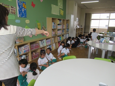 図書室前の読書ゾーンで学級ごとに順番を待ちます。