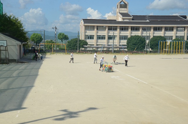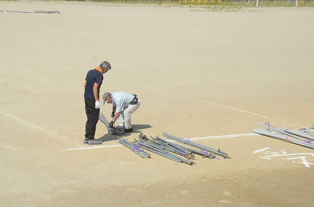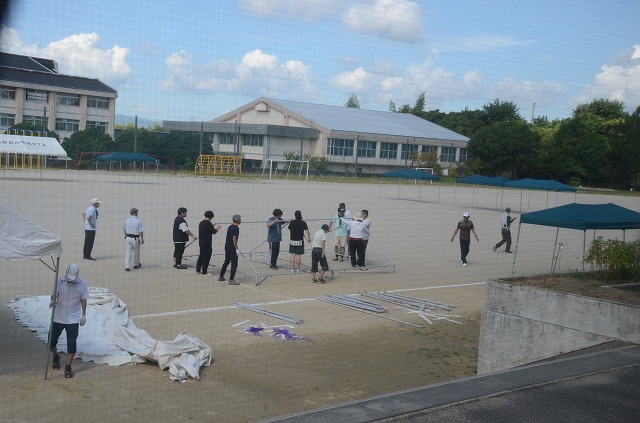 日本の南の海上で台風10号が発生し、進路もこちらに向かっているという状況で天気予報を見ながらの準備や開催となりそうですが、9時から自治会・小中職員・PTAを中心にたくさんの方にご協力いただきながら運動場にテントを張っていきました。