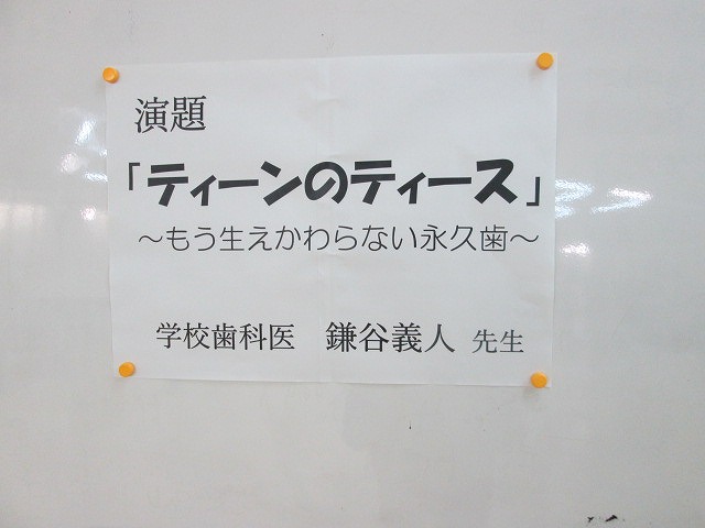 学校保健委員会(歯科保健講話)今回の学校保健委員会は、学校歯科医の鎌谷先生による4年生対象の歯科保健講話です。 演題は「ティーンのティース」です。乳歯から永久歯に生え替わっていく10歳台の歯の衛生について、画像を用いながらていねいに説明してくださいました。 講演後、児童からは質問も出て、関心の高さが伺えました。