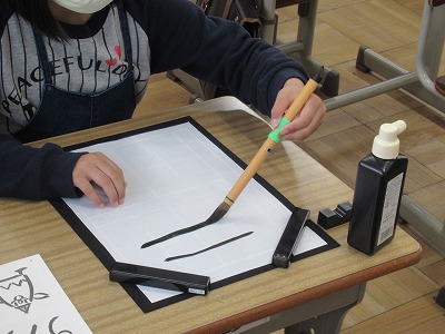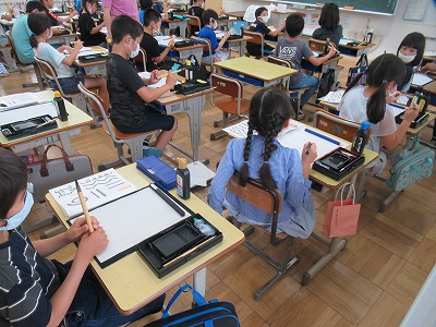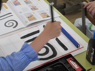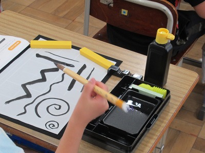 今日は2回目の学習です。筆で線を書く練習から始めているようです。