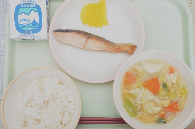 【給食】牛乳 ご飯 さけの塩焼き すいとん たくあん