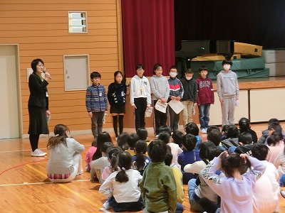 集会では、「人権(一人一人が幸せに生きられる権利)」の意味の確認や各学年の人権学習の取り組み、人権標語・ポスターの表彰、人権フォーラムの報告などが行われ、それぞれの取り組みや高学年の学びをみんなで共有しました。