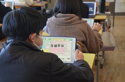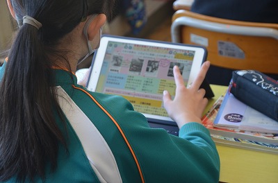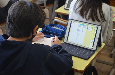 ◇国語 タブレット端末を使って自分の考えを書き込みます。