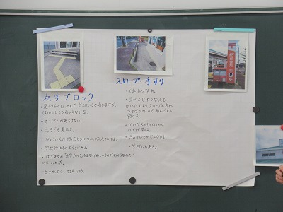 「点字ブロックは目の不自由な人が歩きやすいようになっています。」「スロープはベビーカーでも通れるようになっています。」