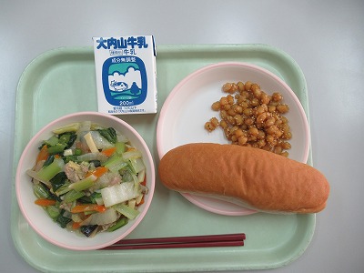 パン、あんかけ焼きそば、セサミビーンズ、牛乳