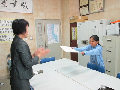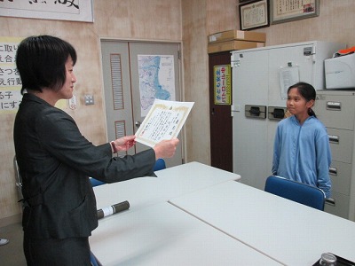 税に関する絵葉書コンクールで優勝賞をとった児童に、校長室で表彰が行われました。都合で授賞式に参加できなかったのだそうです。校長先生から「今後も素敵な作品を作り続けてくださいね」との励ましがありました。