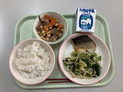 麦飯、さばの一味焼、五目豆、たくあんの和え物、牛乳