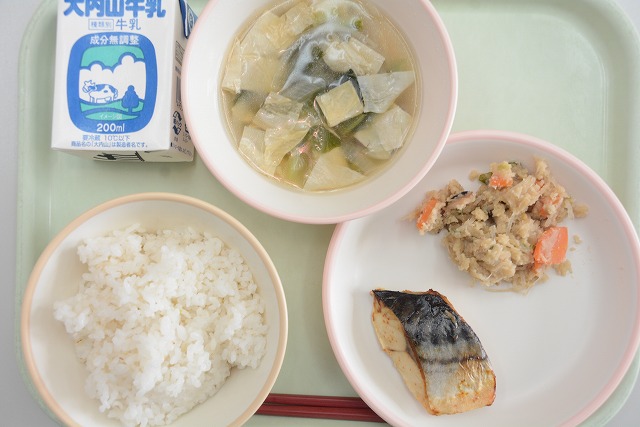 【給食】ご飯 牛乳 サバの塩焼き おから すまし汁