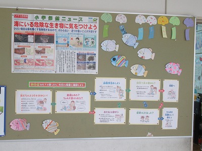 梅雨ならではの蒸し暑い日、まぶしい夏の日差しが降り注ぐ日があります。この季節、熱中症にならないように気をつけることがとても大切。 保健室前の掲示に、そのための情報がいっぱいあります。