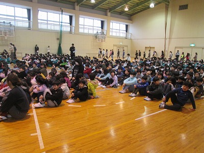 1月27日 不審者侵入による避難訓練 あいにくの雨で、予定していた訓練はできませんでした。 南が丘小学校の暗号入りの放送を聴いた後、全校児童が 体育館に移動して、警察の方の講話を聴きました。