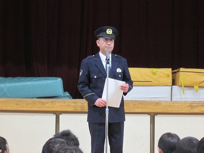 ☆放送後、お互いに譲り合って、静かに体育館に移動することが できました。 ☆最初に、校長先生のお話を聴きました。 ☆津警察から来ていただいた方のお話です。 「今日の放送は聞こえましたか?」 「避難訓練の合言葉?」 学校だけでなく、帰り路についてもお話していただき、防犯ベルに ついてもふれてもらいました。