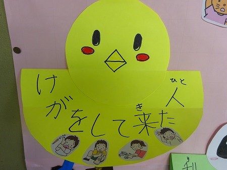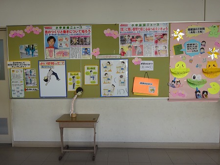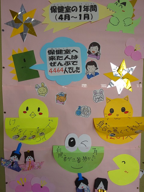 保健室の掲示板に貼られているのは、この1年間の振り返りです。保健室に来た人の数、けがをした人の数、保健室に来た人が一番多かった月などが書かれてます。これを見た子は「そんなに!?」と驚くことでしょう。一度保健室前のこの掲示を見てください。
