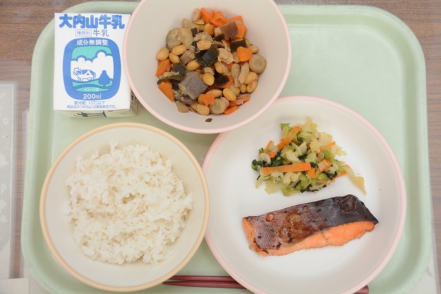 【給食】ご飯 牛乳 厚揚げとうずら 五目豆 三食あえ