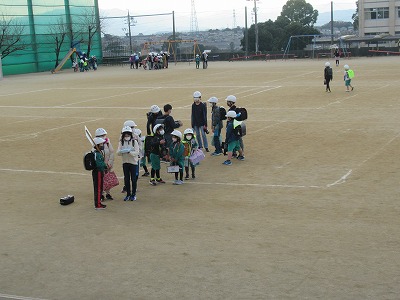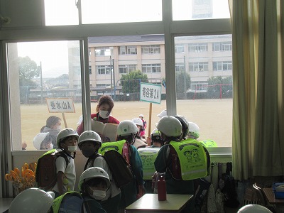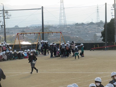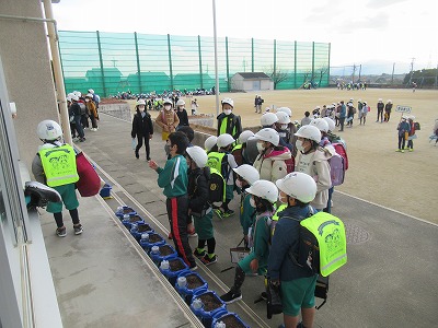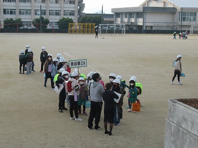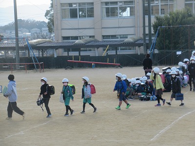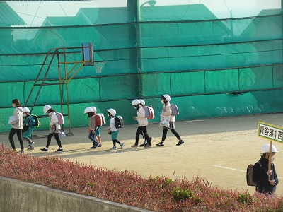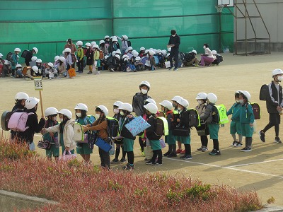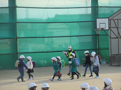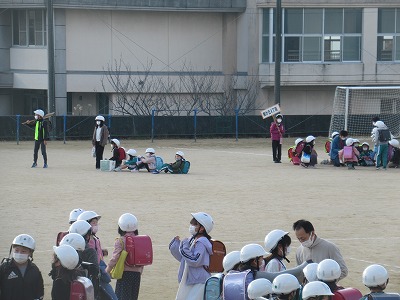 地区別一斉下校については、毎年行っていましたが、昨年度は感染拡大防止のため、実施しませんでした。本年度は今日の感謝集会にあわせて安パト会員の方と一緒に下校する形式で実施しました。6年生が1年生を教室まで迎えにいき、5年生が2年生を集合場所まで迎えに行くスタイルで地区ごとに集まり、一斉下校をしました。