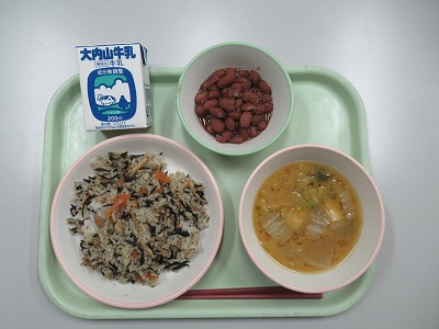 ひじきごはん、大根と白菜のみそ汁、金時豆の甘煮、牛乳