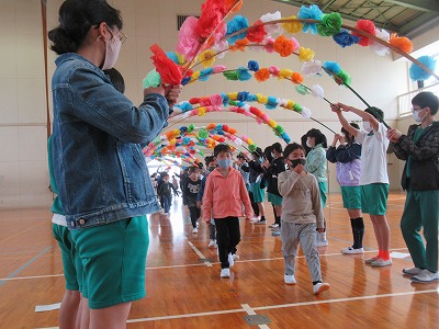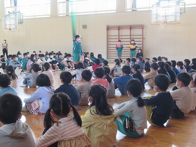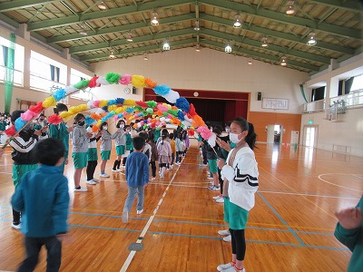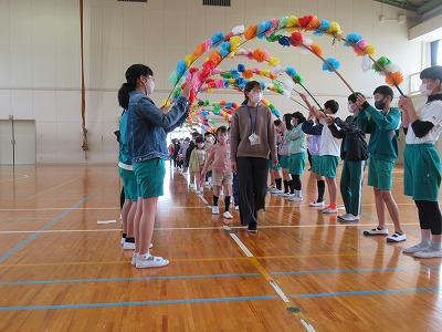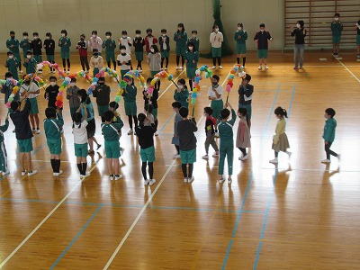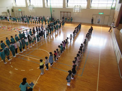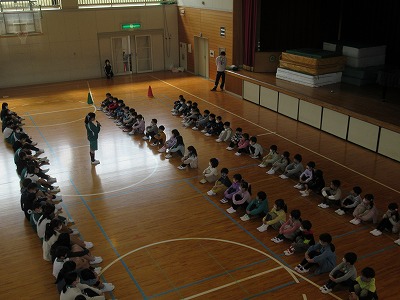 今日は1年生と6年生の対面式(はじめましての会)が1年生を2グループに分けて体育館で行われました。