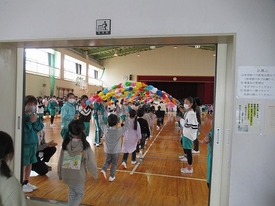 102名の1年生と575名の2~6年生が顔合わせを行う対面式を行いました。6年生が1年生の手を引き、入場し児童会会長の挨拶のあと、みんなで校歌を歌って歓迎の気持ちを伝えました。