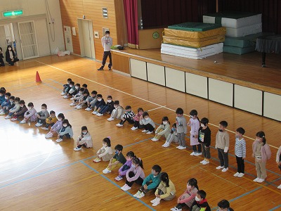 今回は事前に予告をせず、普段通りの生活の中で突然の避難訓練を実施しました。子どもたちは突然にもかかわらず、静かに速やかに非難することができました。