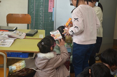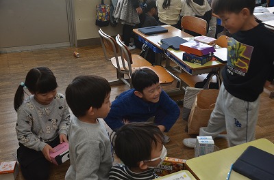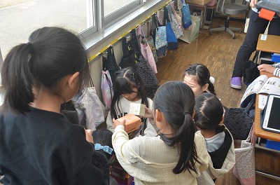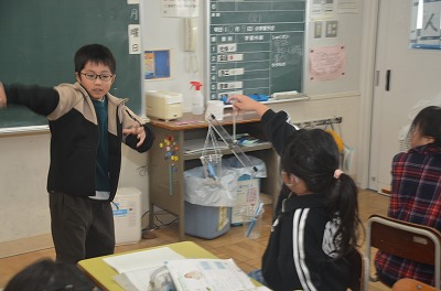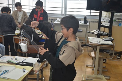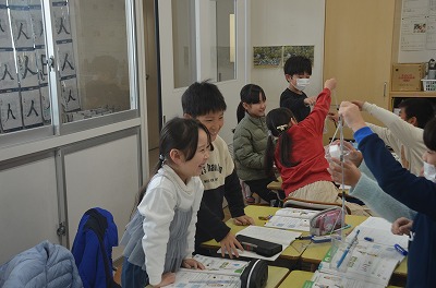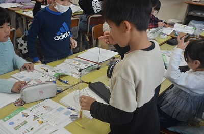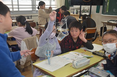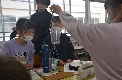 片方のお皿ごとに測りたいものを入れて、てんびんの傾きを見るとすぐに歓声が沸き上が地ます。
