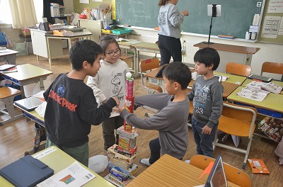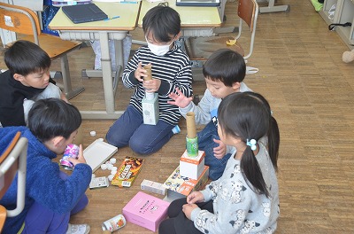 子どもたちは持ってきた箱をどうすれば高くつめるか話し合いました。