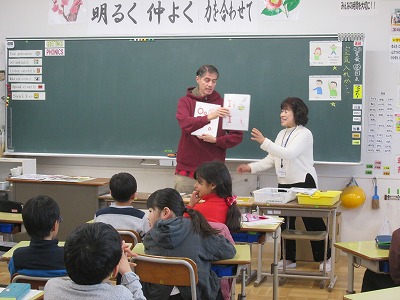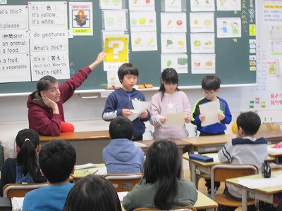 ヒントをもとに、さまざまな動物、フルーツ、食べ物の中から、出題者の意図するものをみんなで当てる学習です。ALT(アシスタント)さんやVET(ボランティア)さんと一緒にゲームを取り入れて、楽しく学習しました。