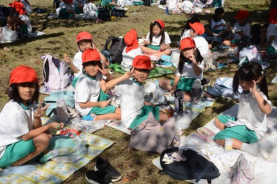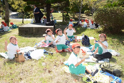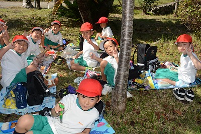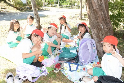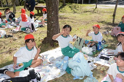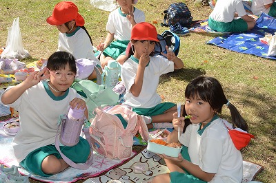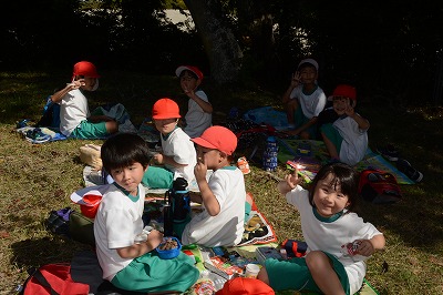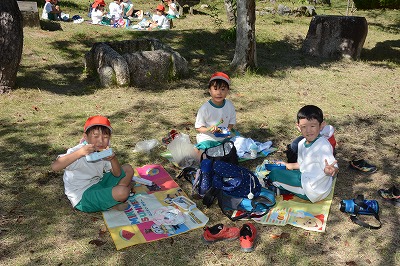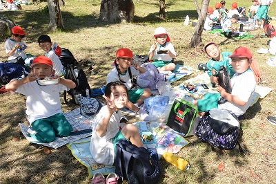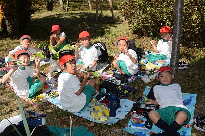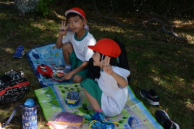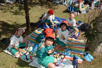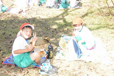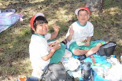 いっぱい遊んでお腹がすいてきました。さあ、お弁当の時間です~。家から持ってきたお弁当のふたをあけてニッコリ。