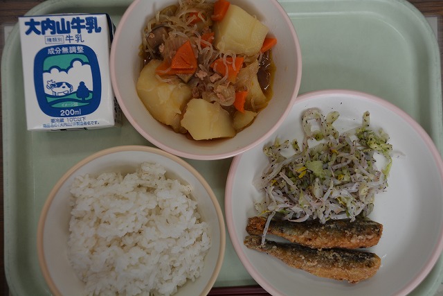 【給食】ご飯 牛乳 から揚げ そぼろに シソあえ