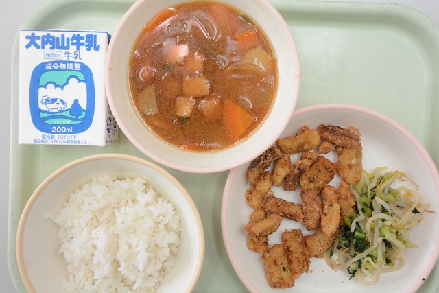 【給食】いかのあおさあげ 小松菜 まこもたけの味噌汁