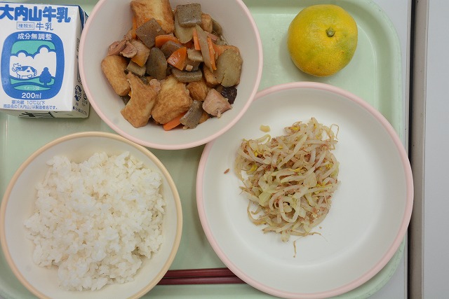 【給食】ご飯 牛乳 鶏肉と厚揚げの煮物 おかかあえ