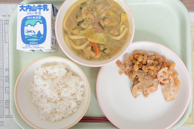【給食】牛乳 ご飯 カレーうどん 豆レンコン