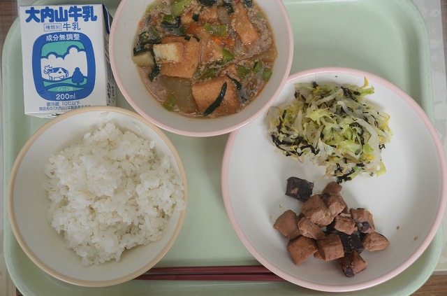 【給食】ご飯 牛乳 角煮 そぼろあん 磯があえ