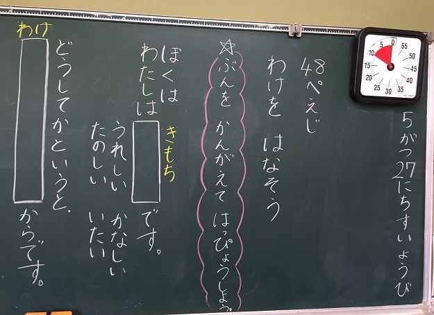 1年生の国語の授業を参観しました。子どもたちが、自分の気持ちとわけを考えて文を作り、発表しました。「わたしはうれしいです。どうしてかというと、アサガオが大きくなってきたからです。」「ぼくはうれしいです。どうしてかというと、くわがたをもらったからです。」「わたしはうれしいです。どうしてかというと、かぞくとすいぞくかんにいくからです。」など、子どもたちの気持ちとそのわけがよくわかりました。